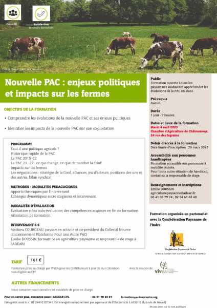 L’ADEARI et la Confédération Paysanne de l’Indre vous proposent une formation pour appréhender les évolutions de la nouvelle PAC* et son cadre politique globale. A la croisée en enjeux politiques et aspects pratiques de la nouvelle PAC*, cette journée sera animée par Mathieu Courgeau, co-président du Collectif Nourrir (anciennement Pour une Autre PAC*) et paysan en activité. Rendez-vous le 4 avril prochain à Châteauroux